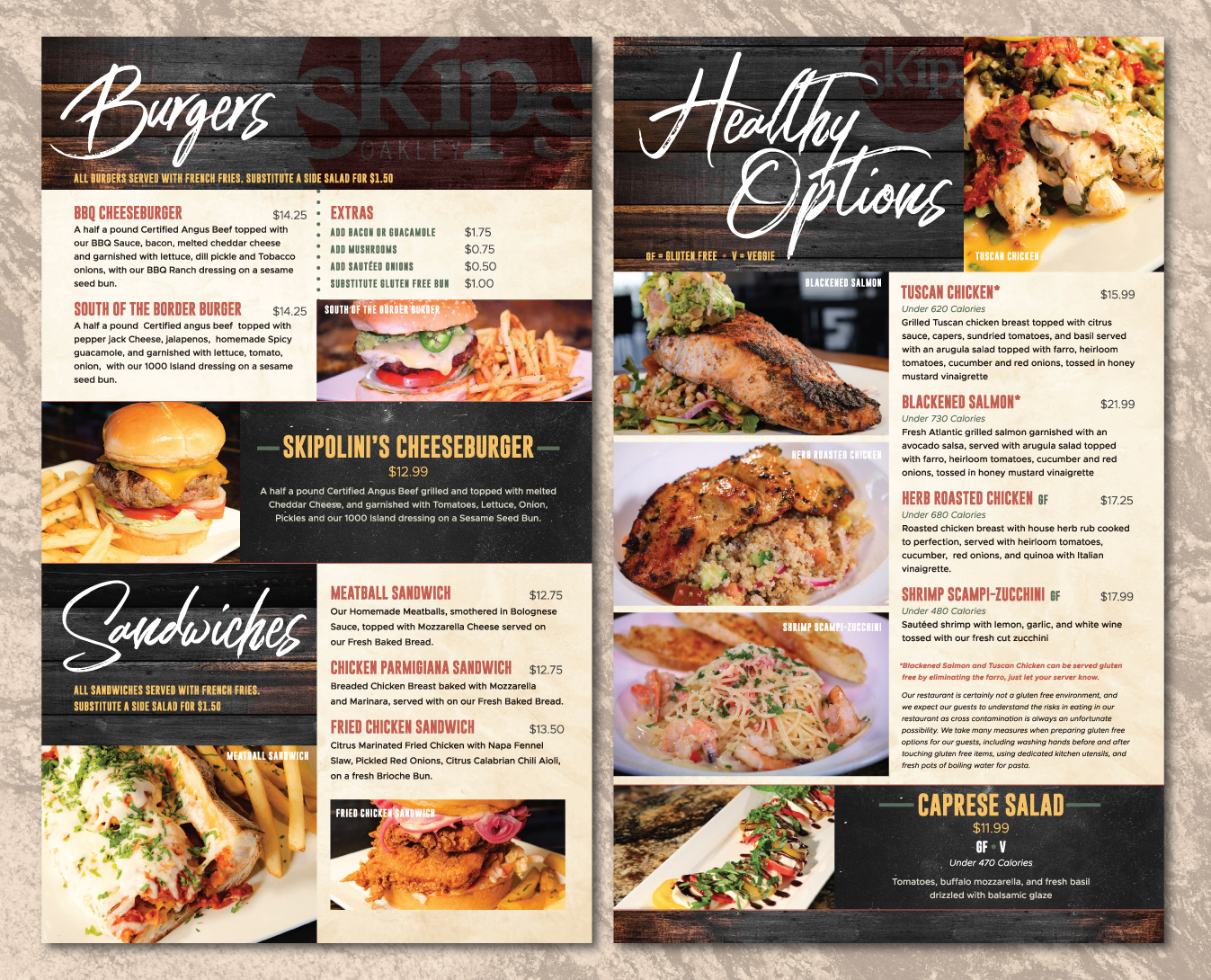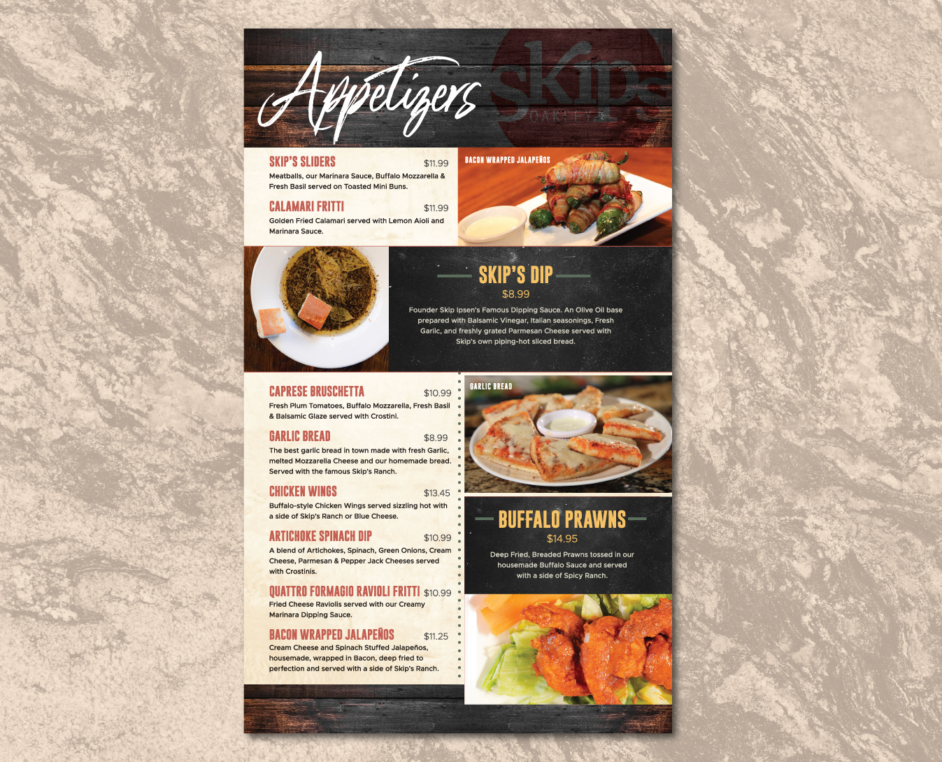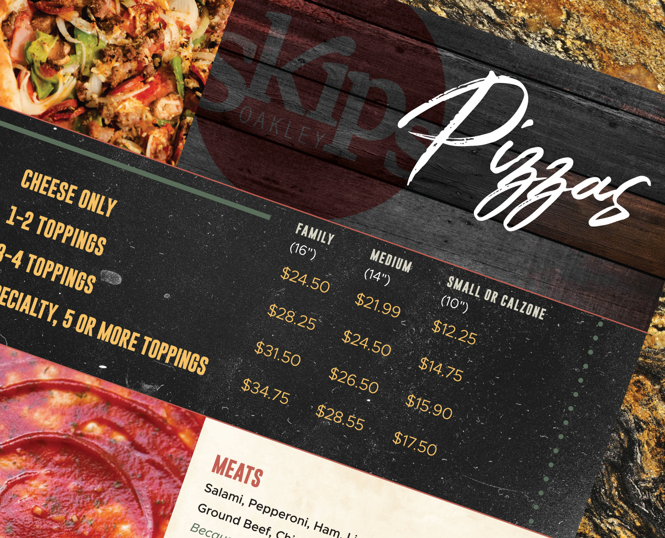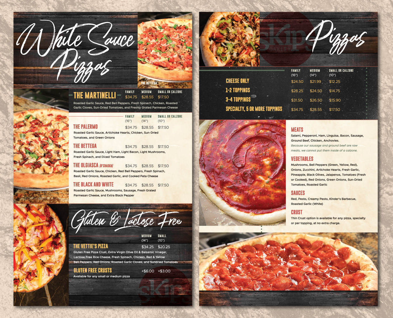 Skipolinis brought their famous pizza, Italian, and American favorites to Oakley, CA and wanted a new printed menu unique to that location. They hired me to bring a fresh design to showcase their famous cuisine.